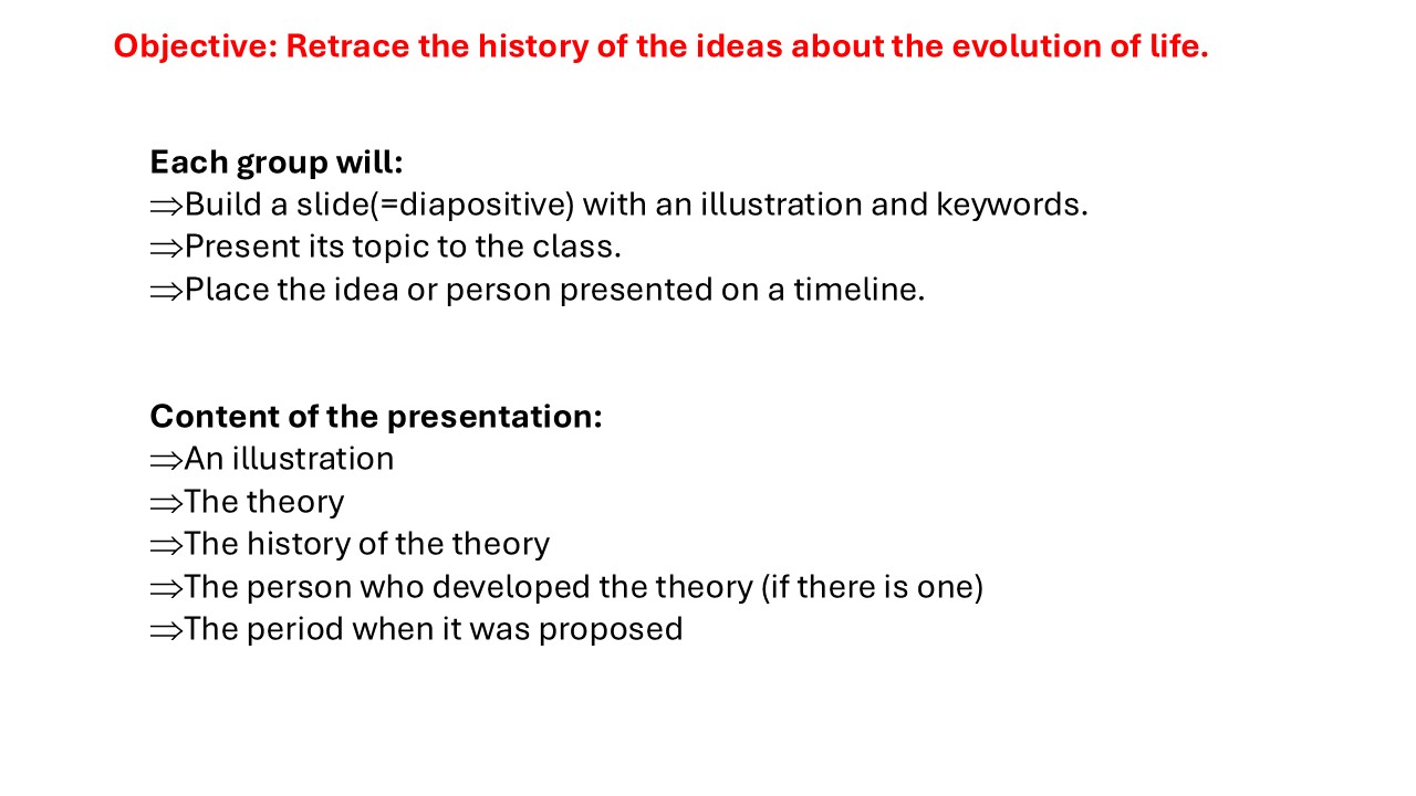 | 2 | The history of the ideas about evolution - Group Work | Instruction |